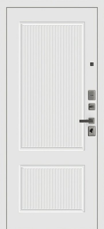 Стальная дверь Кристо 3К в цвете внешней панели Гранит софт матовый и внутренней МДФ панели цвета Экзимер белый с 3-мя контурами уплотнения для необходимой защиты Вашей квартиры от посторонних шумов и запахов, внутреннее наполнение с применением базальтовой плиты надежно уберегут Вас от проникновения холода. Замочные карманы с механизмами 4 и 2 класса взломостойкости.